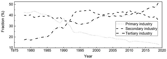 The term “industrial structure” denotes the linkage and proportional dynamics between or within economic sectors [24]. This paper mainly focuses on the relationships among the primary, secondary, and tertiary sectors. Given the pivotal role of the secondary and tertiary sectors in energy consumption, we use the proportion of the sum of the secondary and tertiary industries “value-added” in GDP to represent the industrial structure (Figure 2).