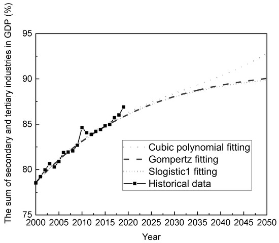 Although tertiary industry now plays a pivotal role in Yunnan’s economic makeup, its representation remains below the national mean. In comparison, well-established economic hubs like Beijing and Shanghai, or globally developed nations, register a scant primary industry contribution, often less than 1%. Meanwhile, provinces within the Yangtze River Economic Belt see their primary sectors contributing between 5 and 15% (Figure 4). Yunnan’s primary industry ranks second in the country in terms of GDP from primary industry. Given that Yunnan has abundant natural resources and is a critical area for agriculture, forestry, animal husbandry and fishery products, the proportion of primary industry cannot reach the same level as the provinces downstream of the Yangtze River. Therefore, in this paper, we consider that SLogistic1 and Gompertz function predictions are more reasonable, which means that the value-added in secondary and tertiary industries will reach 88.8% in 2035 and 90% in 2050.