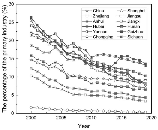 The percentage of the primary industry in each province of the Yangtze River Economic Belt.
