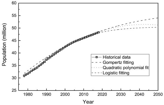 Previous studies have made projections regarding the population trend in Yunnan Province. In 2005, Zhaohe Lv predicted that the population peak of Yunnan would be between 52 million and 56.5 million, occurring in 2038–2045 [25]. An analysis of Yunnan’s population growth rate shows that prior to 2005, the growth rate was consistently higher than 8.0‰; after 2005, the growth rate slowed down and remained around 6 8.0‰. Various mathematical approaches to predicting population size include logistic growth models, regression analysis prediction method, and GM(1,1) gray model method [26]. We choose the logistic function model and Gompertz function model in this paper to predict the future development of population size in Yunnan Province (Figure 5). Since the curve is similar to the shape of the quadratic polynomial, we used the quadratic polynomial fit as a reference.