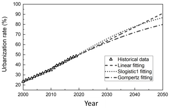 The urbanization rate is an indicator of the pace of urbanization [27]. This paper focused on the urban population ratio to the total (Figure 6). At present, the urbanization process in Yunnan is steadily increasing and is growing linearly, but the overall level of urbanization remains low and is mainly dominated by large cities such as Kunming. Moreover, the overall urbanization rate of the Yangtze River Economic Belt is expected to hit 60% by 2020, while Yunnan has not yet reached this level. Since the development pattern of urbanization follows the “S” type of growth curve, we then applied the widely used SLogistic1 function model and Gompertz function model to predict the future trend of urbanization level in Yunnan.