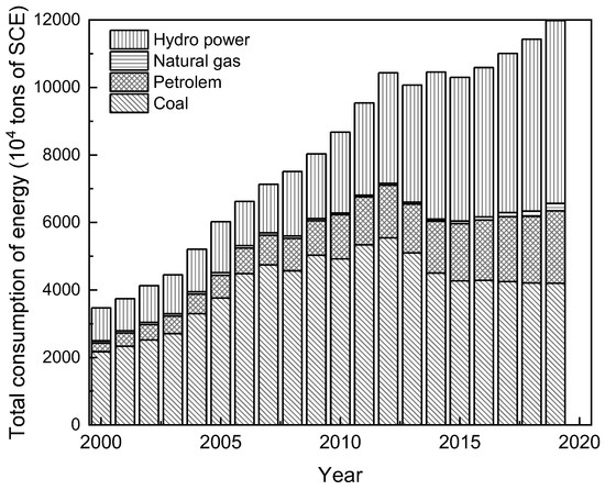 From 2000 to 2011, total energy consumption in Yunnan proliferated at an annual rate of 8–10%, and the growing trend was nearly linear (Figure 7). With a series of strict environmental and energy policies introduced during the 12th Five-Year Plan, the fossil fuel energy consumption in Yunnan has significantly reduced while primary electricity and other energy consumption has increased. As a result, total energy consumption growth has slowed with a growth rate between 3 and 4% from 2016 to 2017. In addition, coal consumption in Yunnan used to reach 68% of the total energy consumption [28]. However, since then, the proportion of coal consumption has been decreasing year by year, with oil consumption slowly increasing. Primary electricity, especially hydropower, has constantly expanded its proportion, providing the cleaner energy structure.