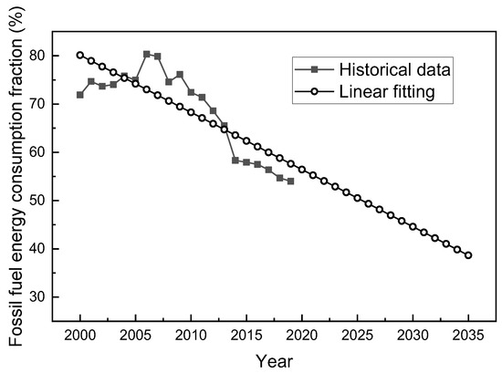 By taking the proportion of fossil fuel energy (coal, oil, natural gas) in primary energy consumption as the energy structure, we performed a linear fitting of historical data to predict the energy structure of Yunnan by 2035 (Figure 8). The prediction results show that fossil fuel energy consumption will account for 38.7% in 2035. Data also show that in 2017 the proportion of fossil fuel energy consumption in Yunnan was already lower than the 13th Five-Year Plan target of 56.3%. In fact, the five southwestern provinces account for more than 70% of the nation’s hydro energy resources; in particular, the theoretical reserves of hydro energy resources in Yunnan are 914.421 billion kWh (annual electricity), second only to the hydro energy resources in Tibet and Sichuan. Moreover, Yunnan has a technically installable capacity of 109,139,100 kilowatts, with an annual power generation capacity of 491,881 million kWh (annual electricity), and the technical development capacity is just behind Sichuan. Therefore, Yunnan can theoretically take the lead in the country to implement the primary energy replacement from “coal-based” to “hydropower-based”; hence, the linear fitting is basically consistent with the future development trend of energy structure in Yunnan.