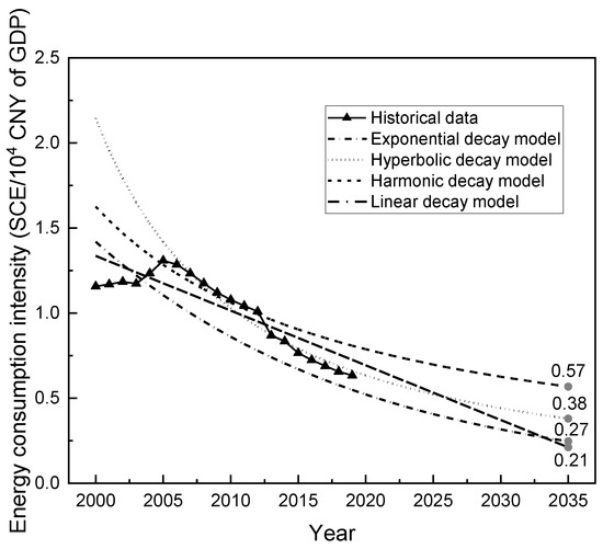 Energy intensity, also known as the energy consumption per unit of GDP, is a comprehensive indicator to measure the economic effects of energy use during national economy development [2]. In 2017, the energy consumption intensity of Yunnan was 0.68 tons of standard coal per CNY 10,000 of GDP, which is an improvement in energy-use efficiency compared to 1.16 tons of standard coal per CNY 10,000 of GDP in 2000. Following the adjustment of industrial structure and energy structure, the energy consumption intensity of Yunnan will gradually decline in the future, and the energy-use efficiency will be further improved (Figure 9). Therefore, we selected four regressive models to forecast their future development trends: the linear decay model, exponential decay model, hyperbolic decay model, and harmonic decay model.