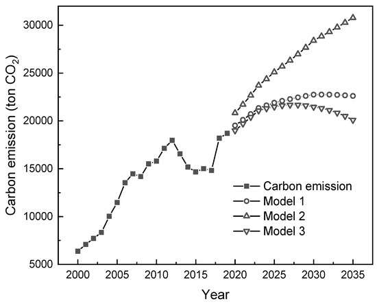 As shown in Figure 10, the projections of both model 1 and model 3 indicate that the total carbon emissions in Yunnan will start to decline after a certain period of increase, generally following the law of environmental Kuznets change (EKC curve). In model 1, the projection results show that the total carbon emissions in Yunnan will peak in 2031 at 228 million tons. On the other hand, the prediction of model 2 shows that the total carbon emissions in Yunnan Province present a rapid growth trend and will not reach their peak by 2035; and the projection of model 3 shows that the total carbon emissions will peak in 2028 at 217 million tons. As mentioned in the National Determined Contributions (NDC) document in China, the national carbon emissions will peak in 2030 and aim to reach the peak beforehand. Furthermore, Yunnan has remarkable renewable resources such as hydropower. Its energy structure and energy-use efficiency are superior to the national average, so it has accomplished the carbon intensity target of the 13th Five-Year Plan two years ahead of schedule. Under the premise of intensified renewable energy, reaching the peak as scheduled or even ahead of schedule is achievable; therefore, the forecast results of model 2 are considered inconsistent with the actual local situation. In addition, the coal industry is currently the primary source of carbon emissions in Yunnan, accounting for more than 70% in recent years, according to the Three-Year Action Plan for High-Quality Development of Coal Industry in Yunnan Province (2019–2021). However, after 2025, coal mining will decrease with the reduction in coal consumption demand from thermal power and the replacement of coal with green hydrogen in the chemical industry. Therefore, in this study, we considered the projection of model 3 more consistent with the actual situation of Yunnan, which means that the total carbon emissions in Yunnan will peak at 217 million tons in 2028, and the carbon emissions per capita will be 4.16 tons/year.