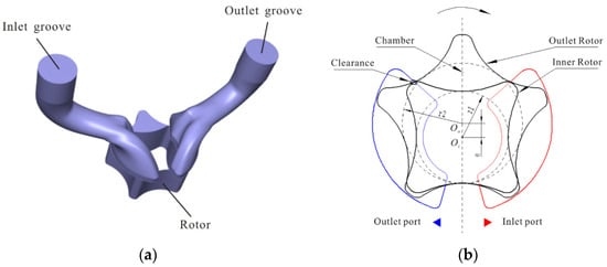 Table 1 presents the main design parameters of the gerotor pump utilized in this study. The pump operates at a rated speed of 3000 r/min with an outlet pressure (P2) of 0.5 MPa. As illustrated in Figure 1, the model comprises three components: the oil inlet groove, the rotor, and the oil outlet groove. The chamber, which serves as the working fluid delivery space, is established by enclosing an inner and outer rotor. Notably, there is no direct contact between the internal and external rotors and tip clearances.