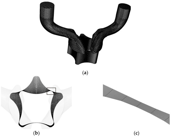 The inlet and outlet runners are equipped with a Cartesian hexahedron mesh generated using geometrically equiangular adaptive binary tree Cartesian mesh technology. In the rotor region, a structured mesh generator is employed. To enhance the accuracy and speed of mesh generation, a mesh template provided in Pumplinx is utilized. In consideration of the minimal tip clearance between the inner and outer rotors, mesh refinement is implemented in the tip clearance area, resulting in the division of the mesh into 15 layers to fulfill computational requirements. To assess grid independence under rated working conditions (n = 3000 r/min, P2 = 0.5 MPa), five sets of grids with different scales are employed. Table 2 reveals that, when the number of grids exceeds 400,000, the outlet flow of the gerotor pump remains fairly stable, with an error of within 1%. Based on this observation, a grid count of approximately 400,000 was chosen for this study. The meshed model is displayed in Figure 2, comprising 358,140 elements and 444,998 nodes.