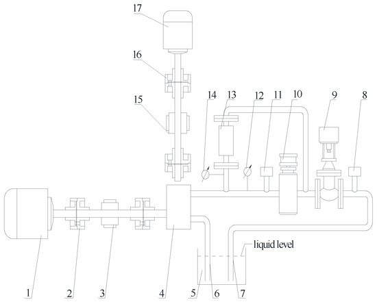 The test rig for the gerotor pump: 1. Horizontal drive motors; 2, 16. Couplings; 3, 15. Torque-speed measuring instruments; 4. Oil pump fixtures; 5. Fuel tank; 6. Intake tubing; 7. Outlet tubing; 8. Flow converter; 9. Electronic electric regulator; 10. Electric pressure regulator; 11. Pressure converter; 12, 14. Regulator; 13. Glass rotor flowmeter; 17. Vertical drive motor.
