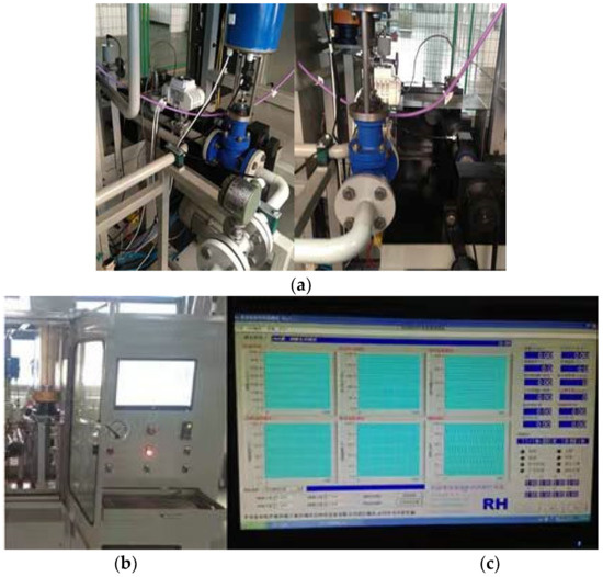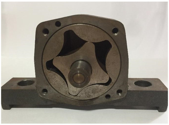 In order to verify the accuracy of the numerical calculations, experimental testing was conducted on a dedicated gerotor pump test rig. The design of the test rig adhered strictly to the national standard ISO 9906:2012 and was calibrated to attain a testing accuracy level of 1. A structural diagram of the test bench is depicted in Figure 4, whereas Figure 5 illustrates the location of the test bench. Lastly, Figure 6 shows the gerotor pump prototype utilized during the testing [32]. The gerotor pump was tested on a dedicated test rig consisting of horizontal and vertical drive motors coupled to the pump, a fuel tank providing the test oil, electronic valves controlling the inlet and outlet pressures, flow and pressure meters measuring the pump flow rate and pressure rise, and a data acquisition system collecting the test data. By operating the pump under different conditions and measuring the resulting flow rate, pressure rise, and speed, pump performance characteristics like the flow–pressure curve were obtained. The experimental results served to validate the accuracy of the numerical simulations across various operating points.