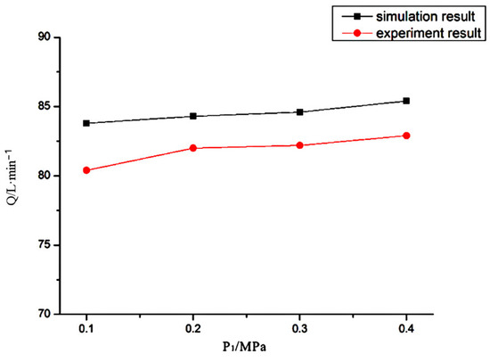 The gerotor pump is simulated under four different operating conditions, namely, P1 = 0.1, 0.2, 0.3, and 0.4 MPa. The comparison between the numerical results and the experimental data is presented in Figure 7. Upon observing the graph, it can be noted that the performance curve obtained from the numerical simulation aligns with the performance curve measured in the experiment. However, the numerical simulation consistently predicts a higher outlet flow compared to the experimental values across all operating conditions. This disparity arises because the simulation does not take into account the actual deviation caused by end-face leakage and axial leakage. Despite this limitation, the comparison between the experimental and simulated values demonstrates good overall agreement, with a calculation error of approximately 3%. These findings indicate that the numerical simulation’s accuracy remains acceptable.