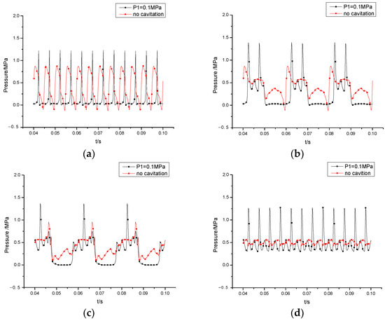 Figure 8 presents a comparison of the influence of cavitation on pressure at monitoring points with and without cavitation. Cavitation-induced pressure fluctuations have a significant impact on overall pressure fluctuations. When examining static monitoring points J and P, at a pressure of P1 = 0.1 MPa, there is a sudden change in pressure, and the amplitude and peak value of pressure fluctuations are noticeably higher in the presence of cavitation, as evident in Figure 8a,d. Figure 8b,c demonstrate that cavitation leads to abrupt pressure changes during the oil discharge stage. The peak of the pressure is approximately 1.5 times higher than that at P1 = 0.1 MPa, and the negative pressure disappears. Moreover, the curve of the pressure fluctuations exhibits a phase shift. Additionally, during the oil injection stage, the pressure rises in line with an increase in the inlet pressure.