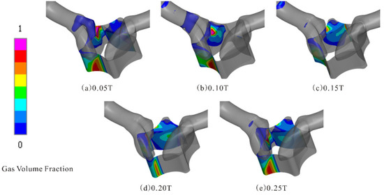 To study the inherent characteristics of the gerotor pump under cavitation, the unsteady flow of internal cavitation phenomena in the fluid domain of the pump is analyzed at an inlet pressure of P1 = 0.1 MPa. Cavitation within the pump is a dynamic process, with the growth, development, and shedding of cavities occurring in tandem with the rotation of the inner rotor. During one cycle, as the rotor spans four teeth, the cavitation process is observed at five intervals when one tooth transitions from its previous position to the next, as depicted in Figure 9. Figure 9a–e illustrates the cavity distribution of the rotor at 0.05 T, 0.1 T, 0.15 T, 0.2 T, and 0.25 T, respectively. It is evident that cavitation is already significant at P1 = 0.1 MPa, with high vapor content in the chamber area adjacent to the oil inlet groove and the dispersion of vapor into the groove itself. At this point, the rotor pump immerses in the oil, leading to an increase in chamber volume, a decrease in pressure, and vapor precipitation within the oil. Once the pressure drops below the saturated vapor pressure of the oil, cavities remain within the fluid. The collapse of these cavities, under the compression of high-pressure fluid, generates severe impact vibrations on the inner and outer rotor walls. Observing Figure 9a–c, when the chamber moves away from the oil inlet groove, the region of cavitation primarily concentrates outside the groove and is noticeably divided by the oil sealing line. Figure 9d–e demonstrates the continued movement of the chamber away from the oil sump, resulting in the gradual expansion of the chamber volume to its maximum. As observed, the cavitation region expands synchronously until the chamber is fully disconnected from the oil inlet groove, and the area where cavities attach to the root of the inner rotor exhibits an expanding trend. A dynamic observation of the cavitation growth reveals that cavitation initiates at around 7 o’clock, close to the meshing point of the oil sealing line in the small section of the oil inlet groove, with cavity pressure decreasing as the chamber expands in line with the previously described cavitation changes. The collapse of the cavitation occurs as shown in Figure 9a–e, with residual cavitation in the maximum chamber of Figure 9a resulting from the collapse of cavities in the previous cycle.