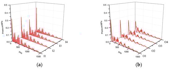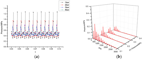 Figure 13b demonstrates the frequency as the principal frequency of pressure fluctuation at point , with 3and 5 being the subsequent frequency components. Similar to the previous case, as the frequency rises, the amplitude of each monitoring point decreases significantly. The fundamental frequency primarily influences the pressure fluctuation at point , and the fluctuation amplitude escalates with increasing P1. At P1 = 0.1 MPa, the pressure fluctuation amplitude is about 85% of that at P1 = 0.4 MPa. Additionally, the bandwidth decreases as P1 increases.