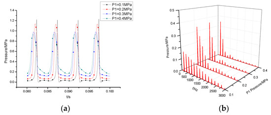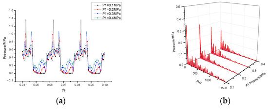 Figure 12 and Figure 13 display the pressure fluctuation in the time and frequency domains at two monitoring points and under different cavitation conditions. Figure 12a shows that the pressure fluctuation trend at the monitoring points remains similar across various cavitation conditions. During the oil discharge process, two distinct peaks of pressure are identified, occurring at 1/8T and 3/8T, respectively. The amplitude of pressure fluctuation increases significantly during these points. At 1/8T, the peak pressure decreases as the inlet pressure (P1) increases, which can be attributed to the difference in pressure fluctuation caused by cavity collapse. Moreover, it was noticed that the severity of cavitation in the chamber is directly related to P1, with lower P1 resulting in more severe cavitation and larger cavity volume, thus causing greater pressure fluctuation from cavity collapse.