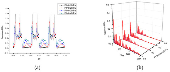 Figure 17 shows the time-domain and frequency-domain of the pressure fluctuation of the monitoring point P under different cavitation conditions. The pressure fluctuations at the monitoring points show obvious periodic changes under different cavitation conditions. With a decrease in inlet pressure, the pressure fluctuation amplitude of the monitoring point increases gradually, and its amplitude increases. This is because the decrease in inlet pressure causes the cavitation phenomenon in the rotor to be intensified. When the pressure in the rotor increases, the pressure shock caused by the collapse of the cavity increases. It can be seen from Figure 17b that different cavitation conditions do not affect the main frequency of the pressure fluctuation at the monitoring point. The fluctuation of the flow is mainly concentrated in the low-frequency region; moreover, the main frequency is 2, and the secondary frequency is. When P1 = 0.1 MPa, the pressure fluctuation peak is 0.245 MPa, which is three times as high as 0.084 when P1 = 0.4 MPa.