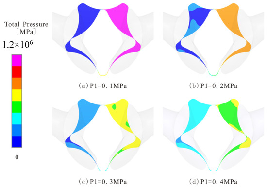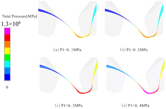Pressure distribution while oil is trapped: (a) P1 = 0.1 MPa; (b) P1 = 0.2 MPa; (c) P1 = 0.3 MPa; (d) P1 = 0.4 MPa.