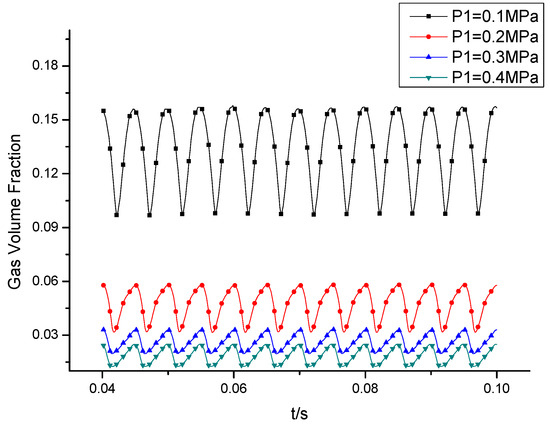 Maximum vapor volume fraction under different inlet pressures: (a) P1 = 0.1 MPa; (b) P1 = 0.2 MPa; (c) P1 = 0.3 MPa; (d) P1 = 0.4 MPa.