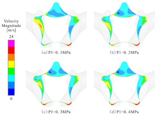 Velocity of cross-section under different inlet pressures: (a) P1 = 0.1 MPa; (b) P1 = 0.2 MPa; (c) P1 = 0.3 MPa; (d) P1 = 0.4 MPa.