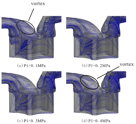 Distribution of streamline: (a) P1 = 0.1 MPa; (b) P1 = 0.2 MPa; (c) P1 = 0.3 MPa; (d) P1 = 0.4 MPa.