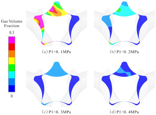 Figure 20 compares the vapor volume fraction at different inlet pressures. As the inlet pressure decreases, the vapor volume fraction in the maximum chamber significantly increases, aligning with the trend observed throughout the rotor chamber. Comparing Figure 20a,b, it is evident that cavitation is more severe when P1 = 0.1 MPa, resulting in larger cavity collapse-induced vibration. Increasing P1 to 0.2 MPa reduces the degree of cavitation and subsequently lowers the pressure. When comparing Figure 20c,d, it can be seen that the cavity in the chamber disappears during this phase. However, the pressure at the inlet and outlet grooves in the latter case is greater than in the former, resulting in larger pressure fluctuations at the monitoring point. By referring to Figure 16, it is evident that changes in the velocity of the working fluid in the pump contribute to local instantaneous pressure drops below the saturation pressure, leading to cavitation in the pump chambers.