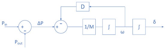 The stability of a conventional power system is largely focused on the fundamental characteristics of a Synchronous Generator (SG). By analyzing its output voltage, power and frequency, a distinction can be made between, for instance, different levels of load transients or faults. However, adding more distributed generators deteriorates the grid stability [1,2]. Thus, a Virtual Synchronous Generator (VSG) is introduced to preserve such characteristics while enabling the integration of a variety of renewable energy sources and energy storage systems [3]. The fundamental concept behind VSG control is to add the swing equation of the SG to the converter control loops to modify its output frequency and power angle based on the deviation from a reference power. Thus, the converter can emulate the characteristics of a droop-controlled SG [4,5,6,7]. The generic block diagram of such a controller is shown in Figure 1, where the swing equation [8] (Equation (1)) on the right-hand side is obtained by subtracting the converter’s real output power from the reference power . The output is then divided by the inertia coefficient and is integrated to obtain the frequency deviation (where is the converter’s frequency and is the rated/reference frequency). The resultant frequency deviation is then multiplied by the damping coefficient to provide negative feedback to damp output power. The converter’s power angle is finally calculated by integrating the frequency deviation .