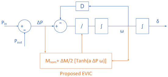Finally, is the product of the power mismatch and frequency deviation The proposed EVIC controller is shown in Figure 5 and can be explained as follows. In a steady state, both virtual input power and electrical output power are equal; hence, Also, VSG is expected to follow its reference frequency with an appropriate constant power angle ; hence, Therefore, EVIC Equation (3) becomes (8), and the converter’s inertia equals to its nominal value as follows: