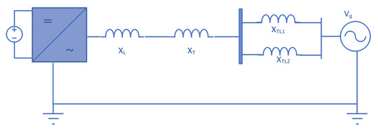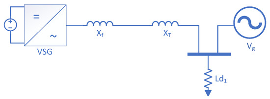 A simulation of the proposed controller was conducted to verify its performance using the Matlab/Simulink model. A VSG was connected to an infinite bus using a transformer and a double-circuit transmission line, as shown in Figure 16. The per unit voltage of the infinite bus was set to 1 p.u., while the terminal per unit voltage of the VSG was set to . The per unit reactance of the converter’s output filter was , the transformer reactance was .1 p.u., and the reactance of each transmission line was The VSG inertia coefficient was . The VSG reference power was 0.8 p.u. The base voltage was 13.8 kV, and the base power was 100 MVA. The single-line diagram of the system is shown in Figure 17, and the parameters are listed in Table 2.