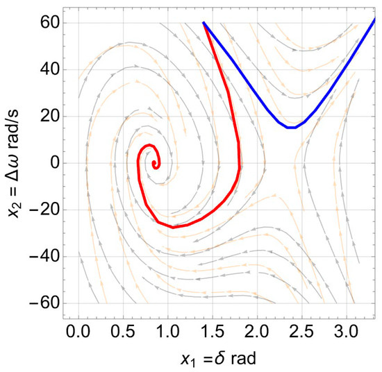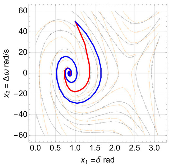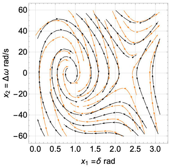 Large signal dynamics of both models formulated in Equations (9) and (10) are visualized by plotting their − vector field in Figure 8 using the parameters in Table 1. Several integral solutions are plotted starting from different initial points by following the succession vectors field in positive time (). Each curve in Figure 8 shows how the power angle and frequency of VSG change with respect to each other and move either toward the stable equilibrium point or away from it.