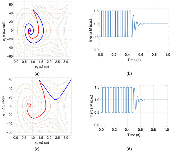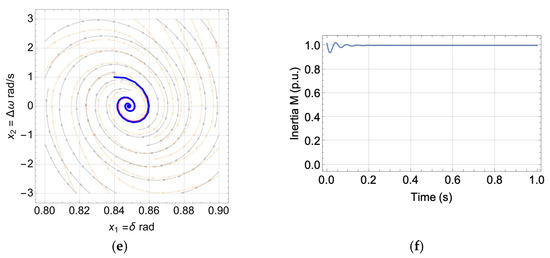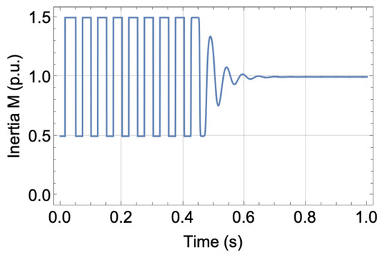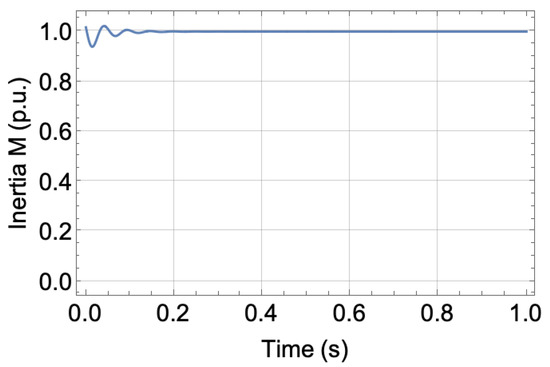 The resultant variation in inertia is shown in Figure 10 for the same aforementioned test conditions. It clearly shows the expected behaviour of the proposed controller. At the start, the VSG converter was far from its equilibrium point; thus, EVIC started with the minimum value of the inertia in Table 1 to quickly bring the converter back to its equilibrium point (acceleration). The closer the converter is to its equilibrium point (shown by its trajectory), the higher its inertia (decelerations) until it reaches its maximum value, as stated in Table 1; this is performed for a few cycles and depends on the severity of the applied disturbances. However, it is still much better than using a conventional inertia controller. At a steady state, the transient amplitude decayed to very low values close to the equilibrium point. Thus, the proposed controller changes the inertia to be almost equal to its nominal value or equal to it at a steady state. Another advantage is that converter inertia is known at any time and instant and can be easily calculated and simulated, unlike the conventional alternating inertia methods, where there is uncertainty and ambiguity in its exact value due to constant variation of virtual inertia, even at a steady state. The same qualitative results can be observed by choosing any initial point far away from the equilibrium point and following the system’s vector field or the set of integral solutions, as shown in Figure 9.