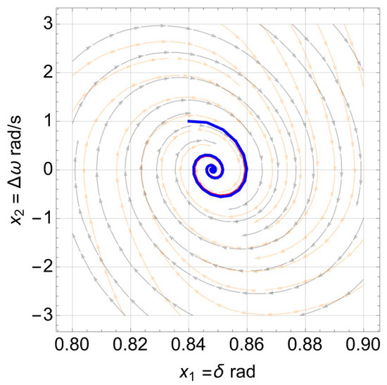 The first case is when the converter starts from an initial point far away from the equilibrium point, but it eventually leads to it using both types of controllers. An example of such a case is the initial point (, . The converter’s trajectories using the proposed EVIC (in red) and conventional inertia controller (in blue) are plotted on a zoomed area of Figure 8 and Figure 9.