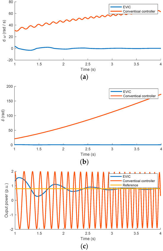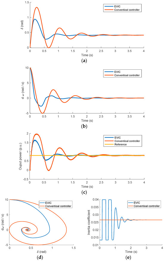 The second case is considered to demonstrate the advantage of the proposed controller in increasing the VSG stability range in comparison with the conventional controllers. In this case, the initial power angle was set to , and the frequency deviation from the infinite bus frequency was set to . The results are shown in Figure 19. The conventional inertia controller was not able to bring the VSG back to stability, as clearly shown in its power angle and frequency, Figure 19a and Figure 19b, respectively. On the other hand, the proposed controller, under the same conditions, was able to bring the VSG back to its steady-state operating point without compromising either power oscillation or the transient time. The resultant output power in both cases is shown in Figure 19c. The frequency–power angle trajectories and the resultant variation in the VSG inertia coefficient are shown in Figure 19d and Figure 19e, respectively. It is worth mentioning that for the proposed EVIC controller to maintain system stability, it had to aggressively change the inertial coefficient for a longer time between its maximum and minimum values before entering its linear region, as shown in Figure 19e.