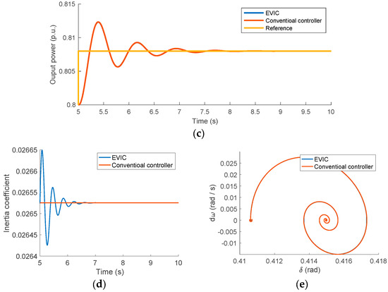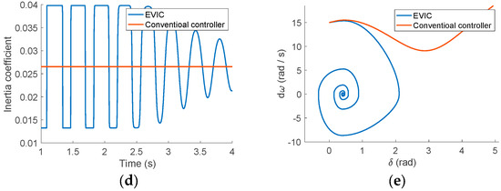 VSG converter performance under large disturbance, case II (orange is conventional inertia controller and blue is EVIC); (a) VSG power angle vs. time; (b) VSG frequency deviation vs. time; (c) VSG output power; (d) VSG power angle–frequency trajectory; and (e) VSG inertia coefficient.