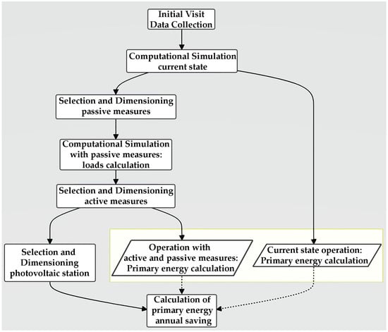 All the aforementioned calculations, both for passive and active systems, were executed through computational simulations using hourly time series over the course of a year. The mathematical background and calculation process are detailed in Section 5. A graphical representation of the methodology followed is provided in Figure 2.