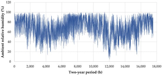 Hourly ambient relative humidity in the 2-year period from 2019 to 2020 in Arkalochori.
