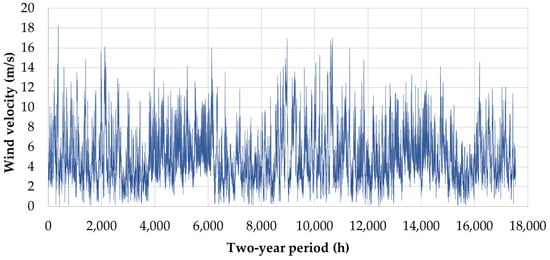 The local climate in Arkalochori is characterized by a rather mild winter, with ambient temperatures usually ranging between 5 °C and 15 °C, and a cool summer, with ambient temperatures rarely exceeding 30 °C. In this work, meteorological data were retrieved from the available climate data in the European Centre for Medium-Range Weather Forecasts (ECMWF) for the period 2010–2020 [61] for a specific geographical point only 13.5 km to the north of the town. All climatic data were used in terms of annual time series with hourly average values. Indicatively, in Figure 3, Figure 4 and Figure 5, the ambient temperature, relative humidity, and wind speed at 2 m above ground are presented, respectively, for the two consecutive years 2019 and 2020.