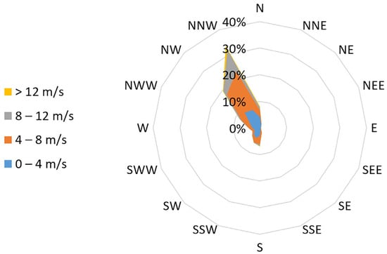 In Figure 6, the annual wind rose graph for the year 2020 is presented, showing a predominant northwest wind direction. This pattern is influenced by the consistent regional northwest summer winds, known as “meltemia”, which contribute to a cooler summer climate.