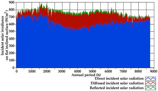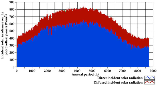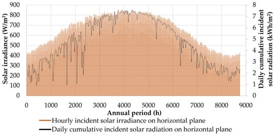 Finally, Figure 7 illustrates both the hourly average incident solar irradiance and the daily cumulative solar irradiance on the horizontal plane for the year 2020. The annual cumulative incident solar radiation on the horizontal plane is calculated at 1675 kWh/m2, indicating a remarkable solar potential in the studied area.