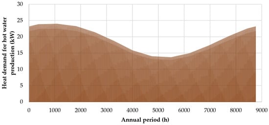 The only energy source currently in use at the indoor sports hall is electricity, allocated for hot water production, indoor lighting, and the existing heat pump. Diesel oil consumption was limited to the winter of 2021–2022 when the facility housed homeless residents from the above-mentioned earthquake. According to the municipal authority’s electricity bills, the actual annual electricity consumption for the facility in 2019 was 19,804 kWh. However, the anticipated energy consumption—assuming the facility operates year-round with full indoor space conditioning via the existing infrastructure—would be considerably higher, as will be detailed in the subsequent section.