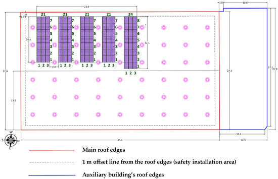 The indoor sports hall (Figure 1a) was constructed in the mid-nineties. It belongs to the local municipality and hosts several sports activities, either by the local sports club or the municipal sports department, as well as the official basketball games of the local team. The sports complex facility comprises two distinct sections (Figure 1b), the main sports hall, with an area of 1196 m2 and 7 m height, and the auxiliary building, which hosts the changing rooms, a canteen, offices, a gym room, medical service, etc., with a covered area of 269 m2 and 3.2 m height. More details on the building’s structural elements and geometry are given in Section 5.2.1.