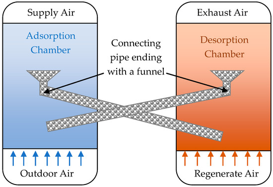 Simplified diagram of circulating fluidized bed. The diagram shows two sorption chambers connected by a tube to a funnel. As a result of the flow of outdoor air through the chamber, the adsorbent is lifted. During this time, the adsorption process takes place. The adsorbent brought to the appropriate height falls into the funnel and moves to the desorption chamber, where an analogous process takes place aimed at desorption of the adsorbent [76].