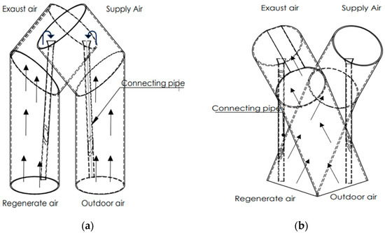 An extension of the fluidized bed idea presented in [76] is the bed shown in [71]. The authors improved this system by tilting the vertical fluidized beds by 20° and obtaining a more regular circulation effect. The schematic diagram of fluidized beds presented in [71,76] are shown in Figure 5 and Figure 6. Moreover, the minimum fluidization velocity and pressure drop were reduced due to the inclination angle. The angle of the connecting pipes was also changed from 45° to 90° to maximize the particle flow velocity in the pipes and enhance the overall circulation effect of the system. The focus was on improving the material’s adsorption and desorption capacity by altering the fluidized bed’s geometry. It was demonstrated that using an inclined circulating bed increased the moisture adsorption level, and the power needed to operate the device was reduced. The inclination of the bed from the vertical axis made the flow direction more regular, enhancing the circulation effect. Furthermore, the tilting of the bed led to a reduction in both the minimum fluidization velocity and pressure drops. The angle of the pipes connecting both deposits was also modified, increasing the maximum flow velocity of the particles in the pipes and thus increasing the overall circulation effect [70,71,76].