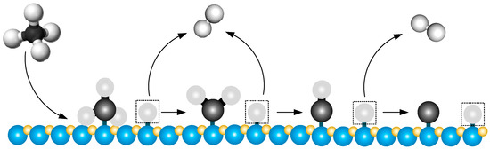 The overall mechanism of CMD is composed of methane adsorption either molecularly or dissociatively [43], and the desorption of hydrogen is assumed to be the rate-limiting step [44]. The sequential dehydrogenation reactions of the adsorbed species () result in the formation of solid carbon (Figure 2). In fact, the kinetics of CMD is plainly part of the SMR reaction mechanism, i.e., up to the point where the adsorbed oxygen starts to interact with adsorbed CHn* species, minimizing coke formation in the case of SMR.