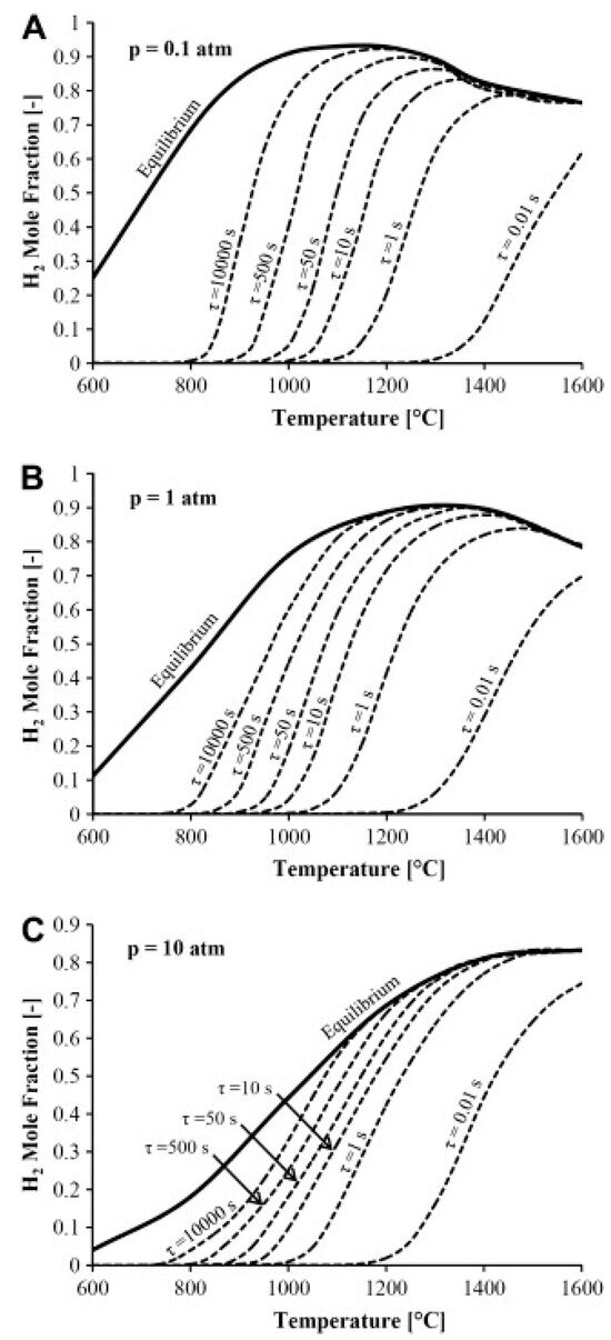 Mole fraction of hydrogen production from methane decomposition relative to temperature and residence time when pressure is 0.1 atm (A), 1 atm (B), and 10 atm (C), respectively. Reprinted with permission from Younessi-Sinaki et al. [65]. Copyright 2009 Elsevier.