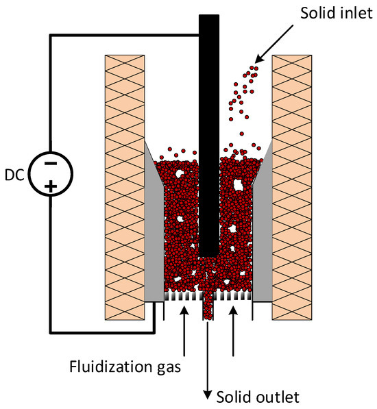 Schematic view of an electrothermal fluidized bed with the coaxial electrode configuration used for continuous solid processing. In order to dissipate heat via the Joule effect, the solid bed particles are electrically conductive. Adapted from [85].