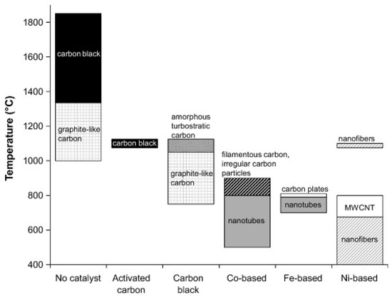 Carbon product windows obtained during methane pyrolysis relative to the process temperature for catalytic and noncatalytic systems. Reprinted with permission from Keipi et al. [37]. Copyright 2016 Elsevier.