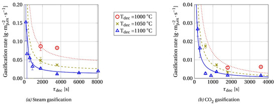 Gasification rates measured in a single-particle reactor as a function of pyrolysis time for (a) steam and (b) CO2 gasification, respectively. Lines represent the gasification model predictions. Reprinted from Kreuger et al. [17]. Copyright 2022 Elsevier.