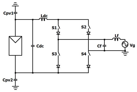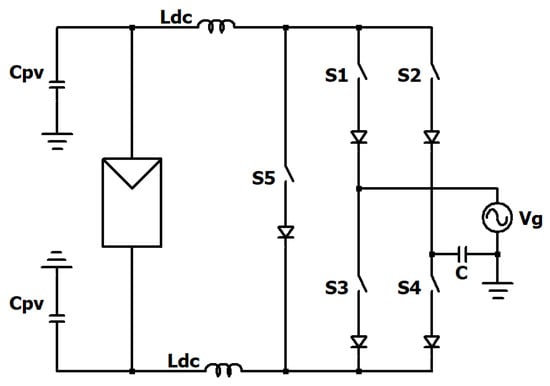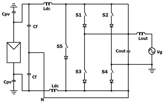 - Single-phase CSI with a neutral point: Figure 6 shows a circuit with an additional leg similar to CSI5. This solution reduces conduction losses as well as significantly reducing earth leakage current. Both of these topologies are used for transformerless PV applications [29].