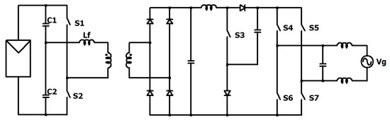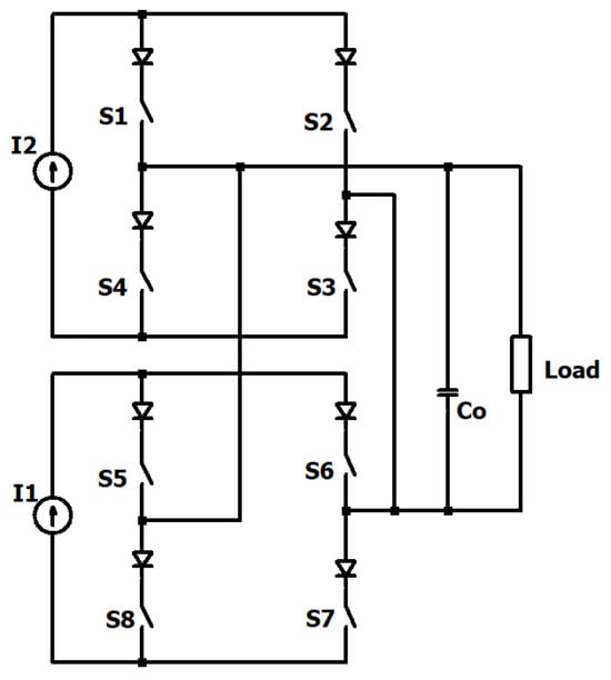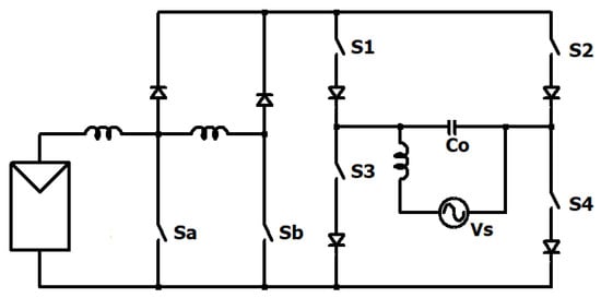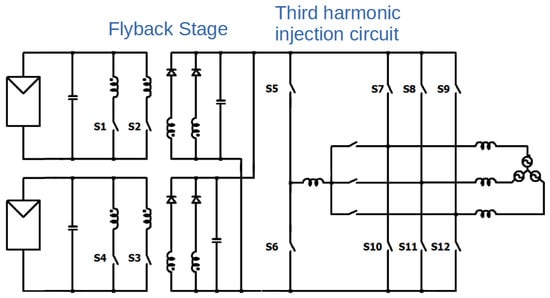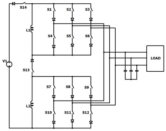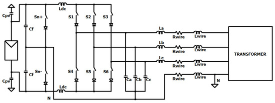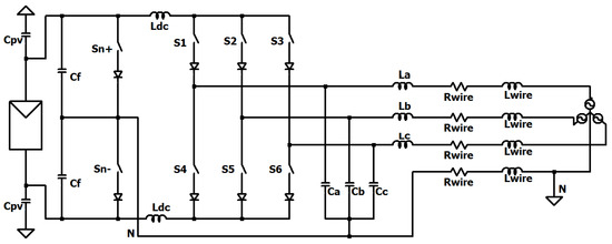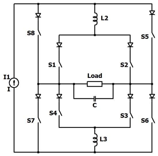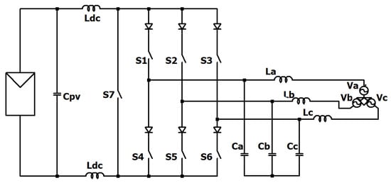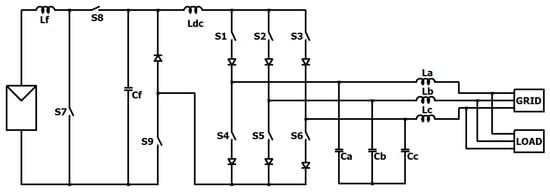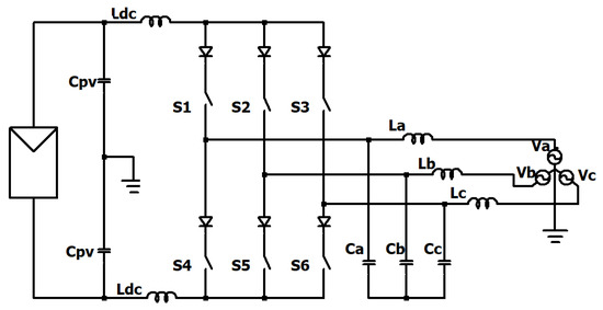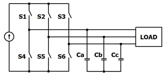 A three-phase current inverter modified for modular photovoltaic applications where each switch has a diode [31] is shown in Figure 9.