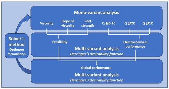 After determining the formulations (inputs) to be used in the experimental part of this study, it was necessary to define the parameters (outputs) to evaluate these formulations. As these formulations were designed to be implemented in the cathodes of LIBs, their electrochemical performance must be an essential output to decide which is more suitable for this application. Furthermore, as electrodes for high energy applications with high working voltages, the specific capacities achievable with the different formulations at different C-rates (0.2, 1, and 2 C) were thought to be adequate outputs for evaluating electrochemical performance. The higher the capacity, the higher the energy, and, therefore, the more desirable the response is. On the other hand, electrode preparation feasibility should not be left out of the evaluation, as a formulation with excellent electrochemical performance but that is hardly processable is not attractive for electrode manufacturers. For this aim, the outputs selected for this feasibility group were the slope of the viscosity vs. the shear rate curve in the rheological analysis, the viscosity at 10 s−1 shear rate, and the adhesion strength after coating and calendering. Higher viscosities, slopes, and adhesion strengths are desired for electrode manufacturing [64,65,66,67]. The list of parameters used to evaluate the formulations is summarized in Table 2. In addition, the schematic representation of the analysis flow followed in the current work is represented in Figure 1.