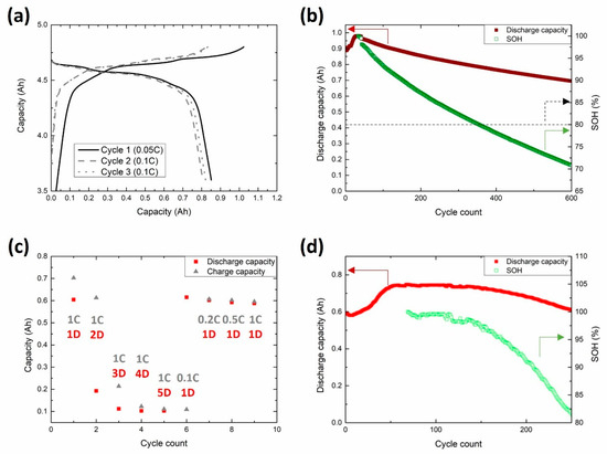 The coatings on the electrodes were cut to later assemble the pouch cells used for the electrochemical validation of the upscaling process. The cells comprised six 9.8 cm × 5.9 cm double-side cathodes and seven 10 cm × 6.1 cm double-side anodes. After being filled with electrolyte, the cells were subjected to a formation protocol consisting of one 0.05 C cycle, followed by two 0.1 C cycles. The galvanostatic profiles of these three cycles are depicted in Figure 3a. In the first charge, ~0.1 Ah was consumed to form the solid-electrolyte interphase (SEI) below 4.4 Ah. Afterward, a pseudo-plateau at 4.4 V and two defined plateaus at 4.6 and 4.7 V were registered. In the subsequent discharge, complementary plateaus were obtained at 4.35, 4.55, and 4.6 V, respectively. References in the literature [25,32,72,73] report the presence of two main redox peaks between 4.6 and 4.8 V; two features of charge and two (associated with each of the former) of discharge. These signals are attributed to the redox activity of nickel (Ni2+/Ni4+). On the other hand, they also evidence that the contribution of manganese (Mn3+/Mn4+) to the cell capacity can be observed to plateau at ~4 V. The absence of a feature with this potential suggests that the redox activity observed at 4.35 (discharge) and 4.4 V (charge) can be attributed to the electrochemical activity of Mn. The capacities obtained in the first charge and discharge of the cells were 1.03 and 0.85 Ah, respectively, for a Coulombic efficiency of 82.6%. The charge–discharge capacities in the second and third cycles were 0.83–0.82 Ah and 0.83–0.81 Ah, respectively. The increasing, but relatively low, coulombic efficiencies in these two cycles (97–98%) suggest that part of the lithium is still being consumed in the formation of the SEI. These two cycles presented the same plateaus, confirming that the same electrochemical reactions are occurring.